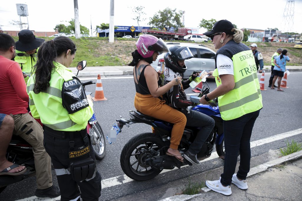 Motoristas e motociclistas que trafegavam pela avenida das Torres, na manhã desta terça-feira, 7/1, foram abordados durante operação integrada da Prefeitura de Manaus, por meio do Instituto Municipal de Mobilidade Urbana (IMMU). Além da fiscalização de documentos e das condições dos veículos, a iniciativa promoveu uma abordagem educativa com orientações sobre segurança e distribuição de materiais informativos para prevenção de acidentes.