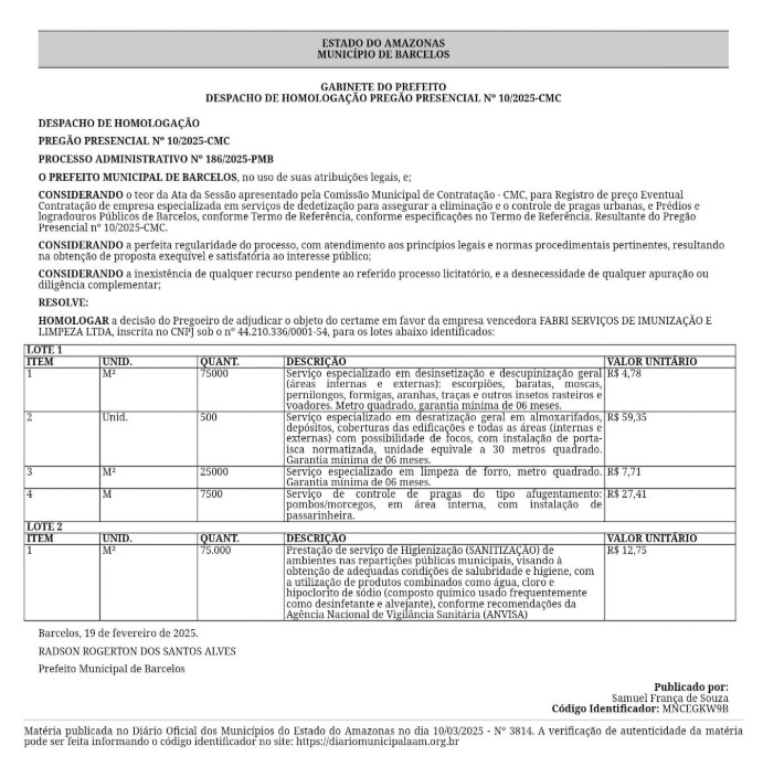 O prefeito de Barcelos, Radson Alves, mais conhecido como “Radinho”, vai desembolsar mais de R$ 1,7 milhão para contratar uma empresa especializada em dedetização e limpeza. A decisão foi publicada no Diário Oficial dos Municípios.